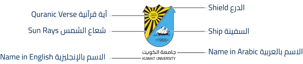 المكونات الرئيسية لشعار الجامعة تبدأ باسم الجامعة مع درع جامعة الكويت الذي يحتوي على (المركب، الشمس، الآية القرآنية، سنة التأسيس)