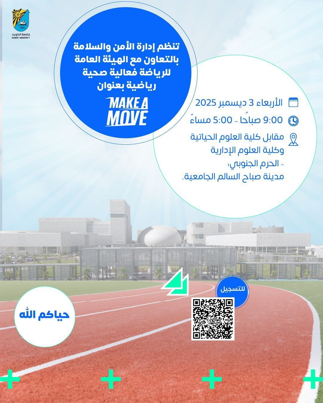 جامعة الكويت ممثلةً بإدارة الأمن والسلامة، بالتعاون والتنسيق مع الهيئة العامة للرياضة تنظم فعالية صحية رياضية بعنوان (MAKE A MOVE) بمدينة صباح السالم الجامعية