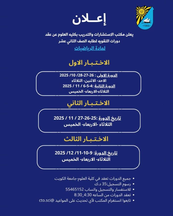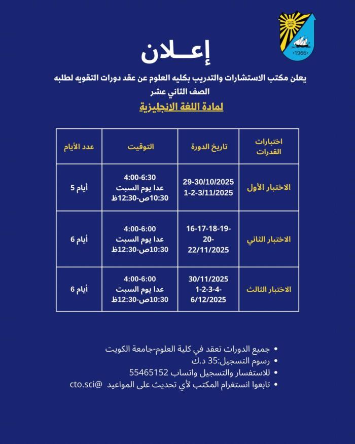 مكتب الاستشارات والتدريب بكلية العلوم يعلن عن إقامة دورات تقوية لاختبار القدرات في مادة الرياضيات واللغة الإنجليزية