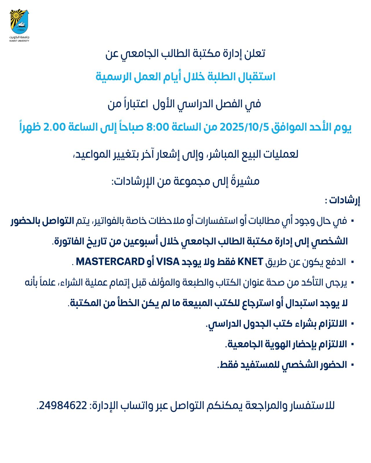 تاريخ النشر:2.أكتوبر.2025 مواعيد العمل في الفصل الدراسي الأول 2025 - 2026 في إدارة مكتبة الطالب الجامعي Working Hours for the First Semester of the Academic Year 2025–2026 at the Student Bookshop Administrationشارك