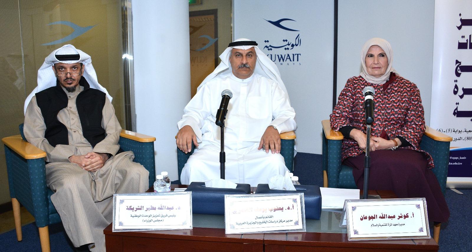 من جهته أكد القائم بأعمال مدير مركز دراسات الخليج والجزيرة العربية أ.د. يعقوب الكندري أنّ الهوية الوطنية ترتبط ارتباطًا وثيقًا بتعزيز مبادئ الوطنية، والذي جعل الجميع يستشعر أهمية إقامة منتدى الهوية الوطنية، وتعـزيز مبادئ المواطنة في المجتمع الكويتي ليضم نخبة من الباحثين والمفكرين لمناقشة قضية الهوية الوطنية من منظور علمي وأكاديمي بعيدًا عن المنظور السياسي، مشيراً إلى أنّ مركز دراسات الخليج والجزيرة العربية يتعاون في هذا المنتدى مع شريكين أساسيين من شركاء المجتمع المدني وهما معهد المرأة للتنمية والسلام وفريق تعزيز الوحدة الوطنية لمجلس الوزراء، مبينًا أنّه سيتم خلال الجلسات التي ستعقد على مدار يومين تناول الأبعاد الاجتماعية والثقافية والقانونية التي تهتم بتعزيز مفهوم الوحدة الوطنية.