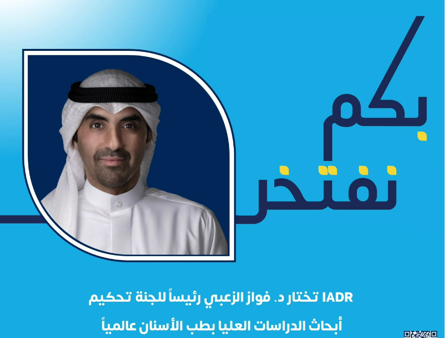 أعتمد مجلس إدارة المنظمة العالمية لأبحاث طب وجراحة الأسنان والفم والفكين IADR القائم بأعمال العميد المساعد للأبحاث والدراسات العليا ورئيس قسم العلوم الجراحية بكلية طب الأسنان بجامعة الكويت الدكتور فواز الزعبي كرئيس للجنة المحكمين لتقييم أبحاث طلبة الدراسات العليا على المستوى الدولي للمنظمة.
