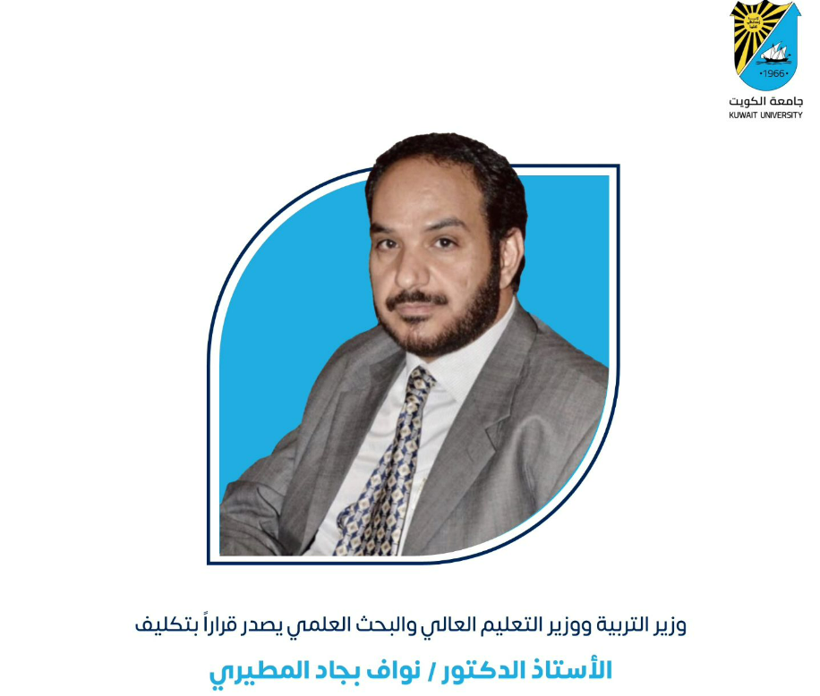 أصدر معالي وزير التربية ووزير التعليم العالي والبحث العلمي "رئيس مجلس الجامعات الحكومية" الأستاذ الدكتور عادل محمد عبدالله العدواني قراراً يقضي بتكليف الأستاذ الدكتور نواف بجاد المطيري – الأستاذ بقسم الباطنية في كلية الطب للقيام بأعمال مدير جامعة الكويت، وذلك اعتباراً من يوم الأحد الموافق 31/3/2024 وحتى إشعار آخر.