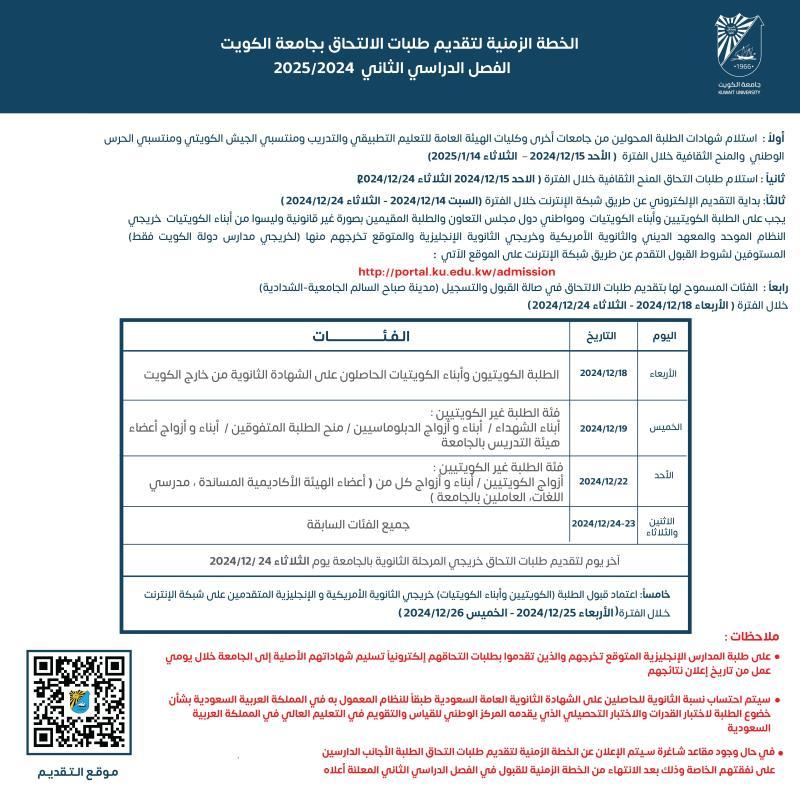أعلن القائم بأعمال عميد القبول والتسجيل بجامعة الكويت الدكتور/ فاضل عباس عزيز عن بدء عملية تقديم طلبات الالتحاق بجامعة الكويت إلكترونيًا للفصل الدراسي الثاني 2025/2024 للطلبة المستوفين لشروط القبول من الكويتيين وأبناء الكويتيات ومواطني دول مجلس التعاون والمقيمين بصورة غير قانونية وليسوا من أبناء الكويتيات خريجي النظام الموحد والمعهد الديني والمدارس الأمريكية وكذلك خريجي المدارس الإنجليزية والمتوقع تخرجهم منها (لخريجي مدارس الكويت فقط) اعتبارا من يوم السبت الموافق 14/12/2024 وحتى يوم الثلاثاء الموافق 24/12/2024 أما الطلبة من فئات القبول الأخرى فيمكنهم تقديم طلبات الالتحاق في صالة القبول والتسجيل بمدينة صباح السالم الجامعية خلال الفترة 18– 24/12/0242 أثناء ساعات الدوام الرسمي كما هو مبين في الخطة الزمنية المذكورة في الجدول.