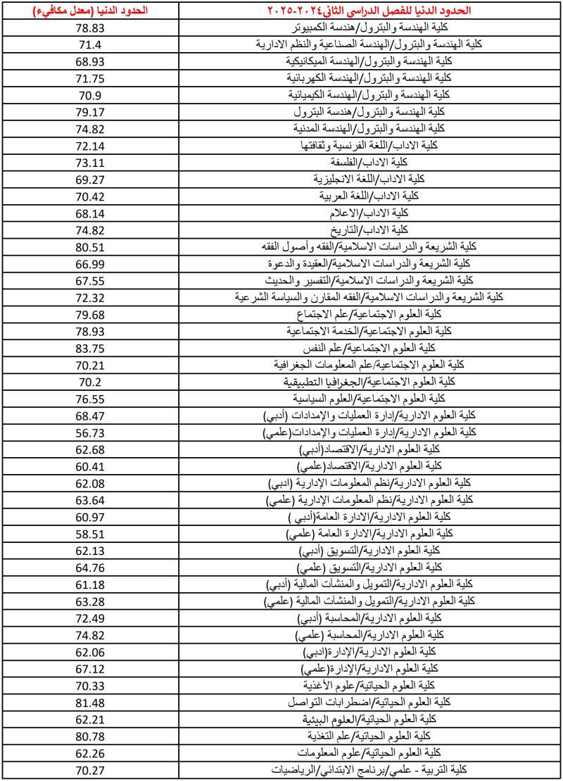 النسب الدنيا لقبول الفصل الدراسي الثاني 2024-2025