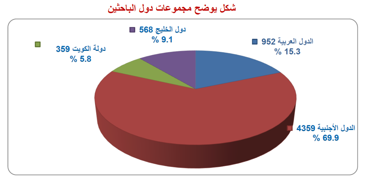 وحول مدى إقبال الباحثين من خارج الكويت للنشر في المجلات العلمية مقارنة مع من داخل الكويت، قال د. ناصر: إنها أصبحت تستحوذ على الاهتمام من خارج الكويت، مشيرا إلى أن البحوث المستقطبة من خارج الكويت بلغت (5879) بحثا بنسبة 94.2%، في حين بلغت من داخل الكويت (359) بحثا بنسبة 5.8%، مبينا إيجابية هذا المؤشر، وهو مكانة هذه المجلات العلمية في الخارج كقناة للنشر العلمي المتخصص، الأمر الذي يُعد وجها مشرقا لجامعة الكويت، وممارسة حقيقية لدور الكويت الثقافي والريادي على الساحة العلمية، والشكل التالي يوضح مجموعات دول الباحثين.