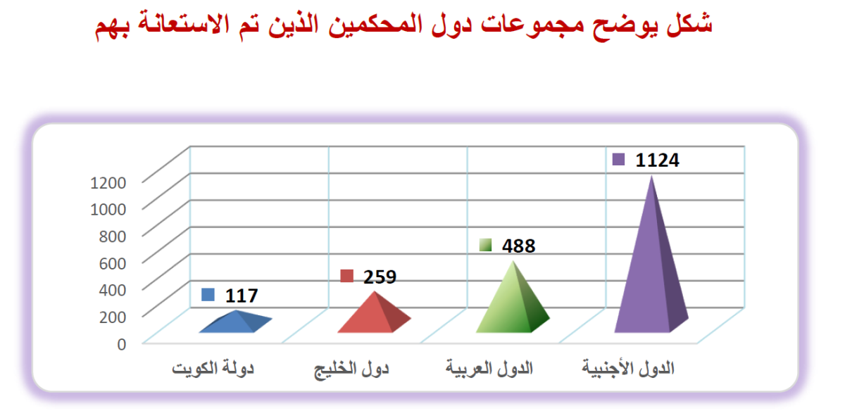 وفي الإطار نفسه أضاف إلى أنه نظرا لتنوع التخصصات العلمية للأبحاث الواردة إلى المجلات العلمية وازدياد أعدادها، فقد تم الاستعانة بمحكمين من خارج الكويت بنسبة 94.1%، والشكل التالي يوضح مجموعات دول المحكمين الذين تم الاستعانة بهم.