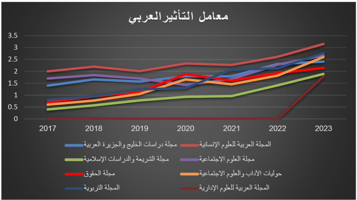مضيفا "أن جميع مجلات مجلس النشر العلمي الناشرة باللغة العربية مُسجلة في قاعدة البيانات العربية الرقمية (معرفة)، وحصلت على معايير اعتماد معاملها للتأثير والاستشهاد العربي (آرسيف) المتوافقة مع المعايير العالمية، والشكل الآتي يوضح تطورها خلال السنوات السابقة".