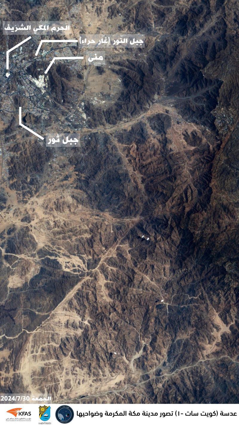 بمناسبة ذكرى المولد النبوي الشريف، التقط فریق القمر الاصطناعي كویت سات-١ (KUWAIT SAT-1) الممول من مؤسسة الكویت للتقدم العلمي صورًا فضائية للحرمين الشريفين في المملكة العربیة السعودیة.