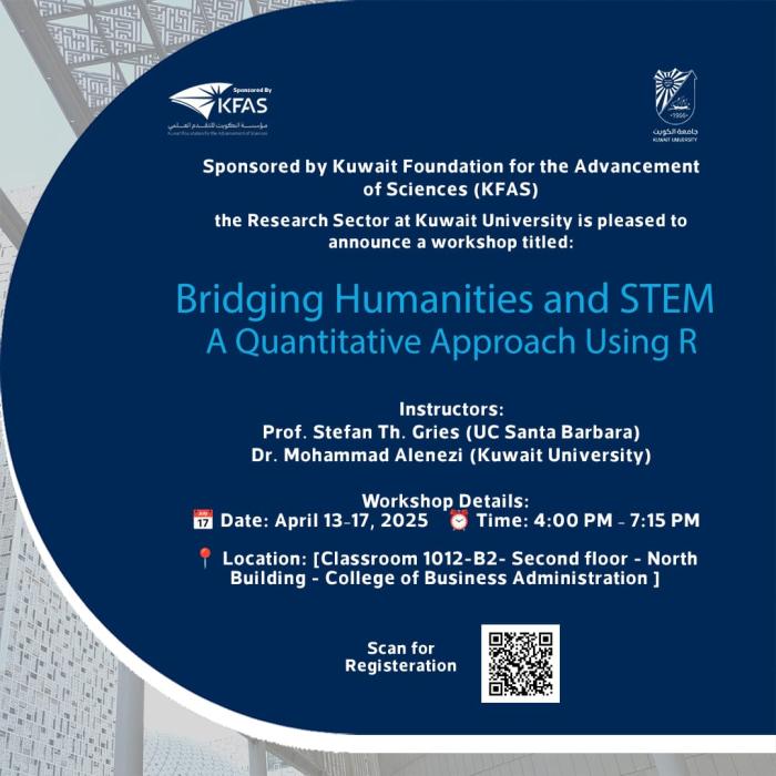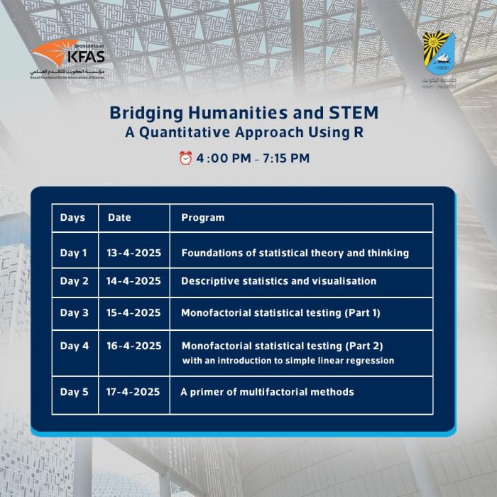في إطار مذكرة التفاهم الموقعة بين جامعة الكويت ومؤسسة الكويت للتقدم العلمي (KFAS)، ينظم قطاع الأبحاث بجامعة الكويت ورشة عمل متخصصة بعنوان "التحليل الإحصائي للبحث العلمي باستخدام لغة البرمجة R: الإحصاء الوصفي والاستدلالي"، وذلك بدعم من مؤسسة الكويت للتقدم العلمي، بهدف تعزيز مهارات الباحثين في التحليل الإحصائي وتوظيف الأدوات الكمية في البحث العلمي.