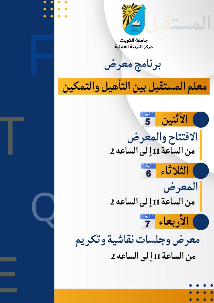 In a pioneering initiative that reflects the College of Education’s commitment to empowering and equipping future educators, the Field Training Center at Kuwait University’s College of Education is launching its First Career Fair under the theme: “Future Teacher: Between Qualification and Empowerment.” The event will take place from May 5 to 7, 2025, at the southern lobby of the College of Education, from 11:00 AM to 2:00 PM.