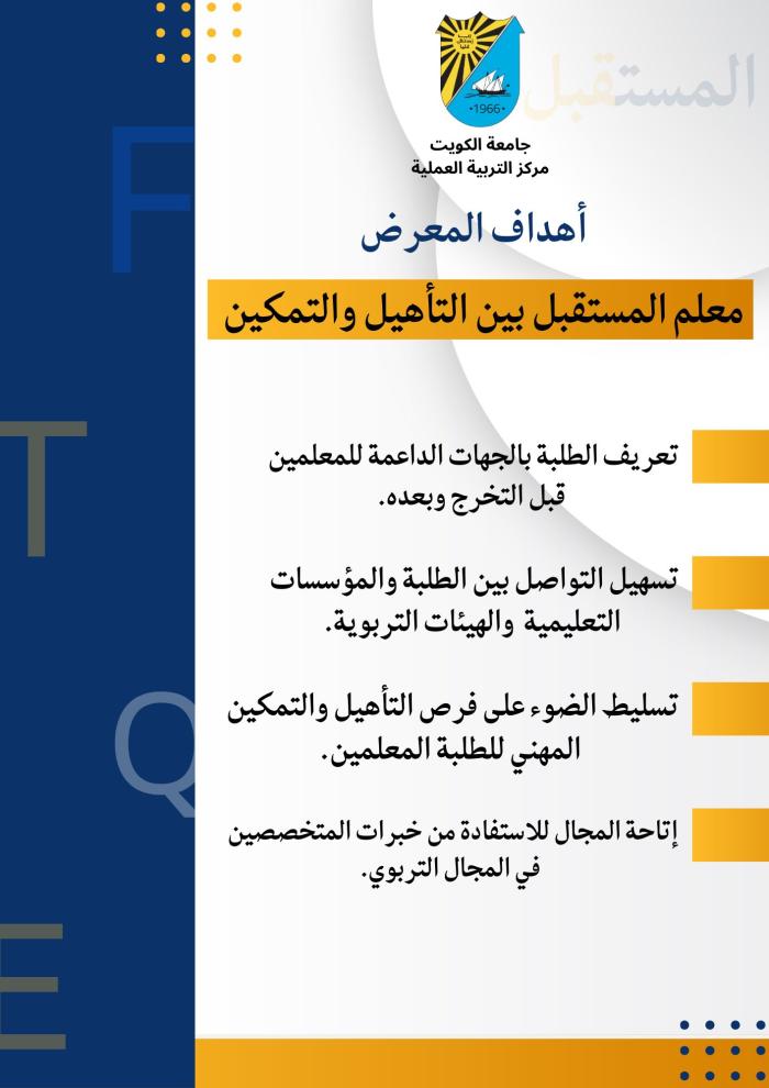This educational fair—the first of its kind organized by the Field Training Center—aims to serve as an effective communication platform linking student teachers with key stakeholders in the educational sector. It is designed to support their professional empowerment during their academic journey and beyond, while enhancing their readiness to enter the field with confidence and professional awareness.
