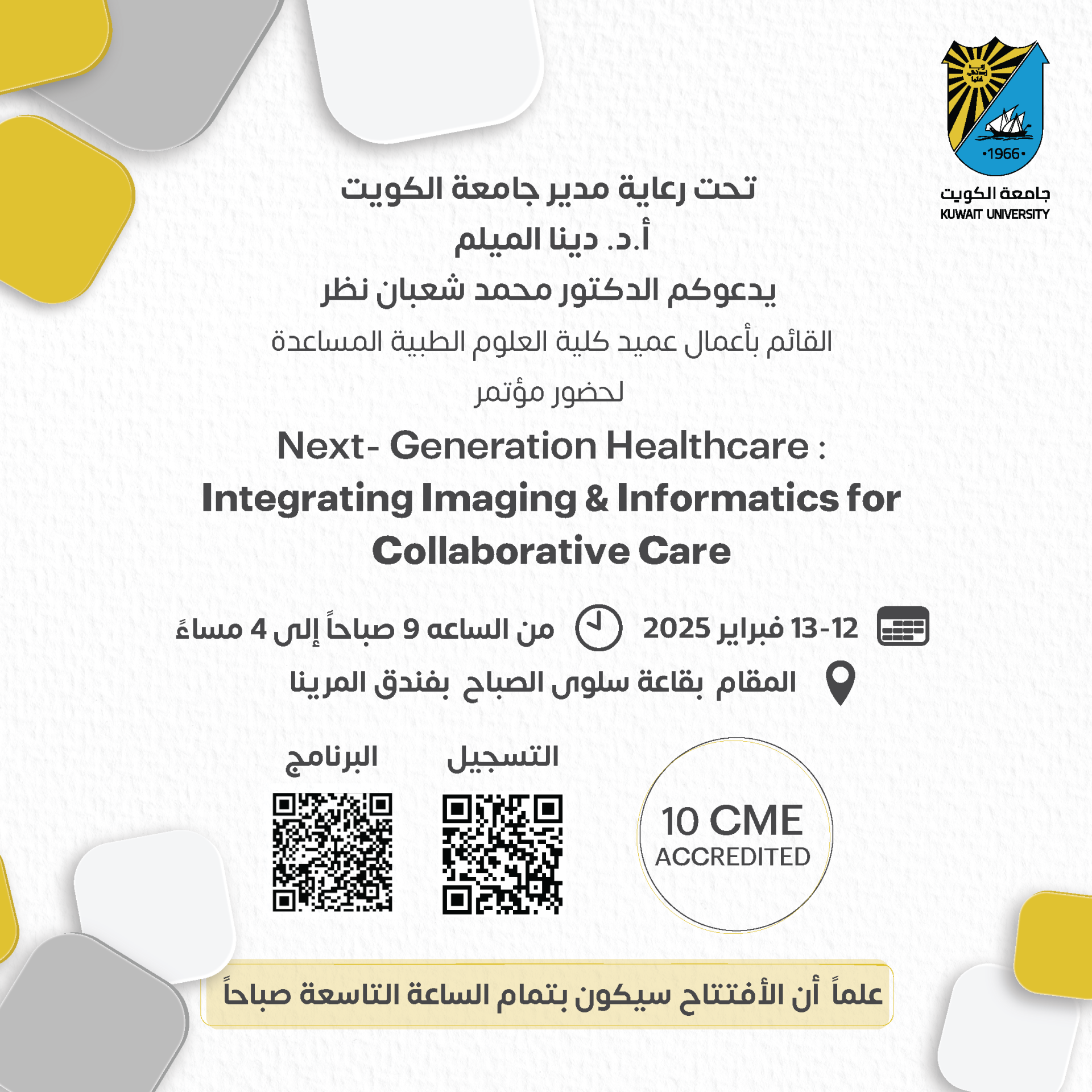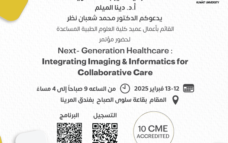 Lectures and Seminars12 02 202509:00 am - 04:00 pmSalwa Al-Sabah Hall at Marina HotelImage تحت رعاية مدير جامعة الكويت أ.د. دينا الميلميدعوكم الدكتور محمد شعبان نظرالقائم بأعمال عميد كلية العلوم الطبية المساعدةحضور مؤتمرNext- Generation Healthcare :Integrating Imaging & Informatics forCollaborative CareShare