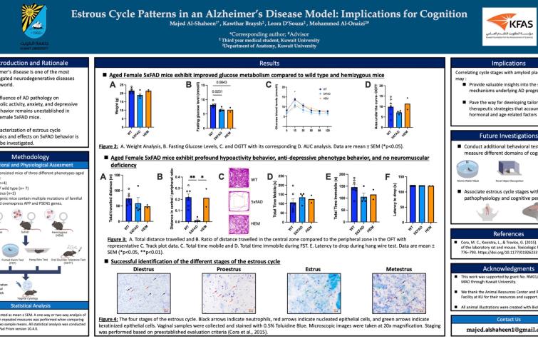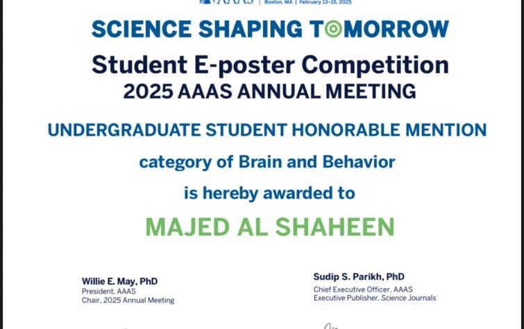 Majed Al-Shaheen, a third-year medical student at Kuwait University, received the Honorable Mention Award in the e-poster competition during the 2025 Annual Meeting of the American Association for the Advancement of Science (AAAS). The AAAS is one of the world’s leading scientific organizations, dedicated to promoting science and innovation. Its annual meeting attracts wide participation from scientists and researchers across the globe, showcasing the latest scientific developments and fostering interdisciplinary collaboration. The student’s participation was supported and sponsored by the Kuwait Foundation for the Advancement of Sciences (KFAS), a prestigious institution known for its commitment to supporting young researchers in Kuwait.
