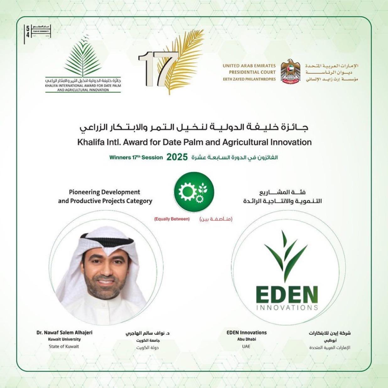 On this occasion, Dr. Al-Hajri stated that this recognition reflects the efforts invested in developing sustainable agricultural projects and the commitment to research and innovation in support of food and water security and sustainable development. He extended his sincere gratitude to the award organizers, as well as to Kuwait University and Kuwait Foundation for the Advancement of Sciences (KFAS)—the main supporters of his research journey.
