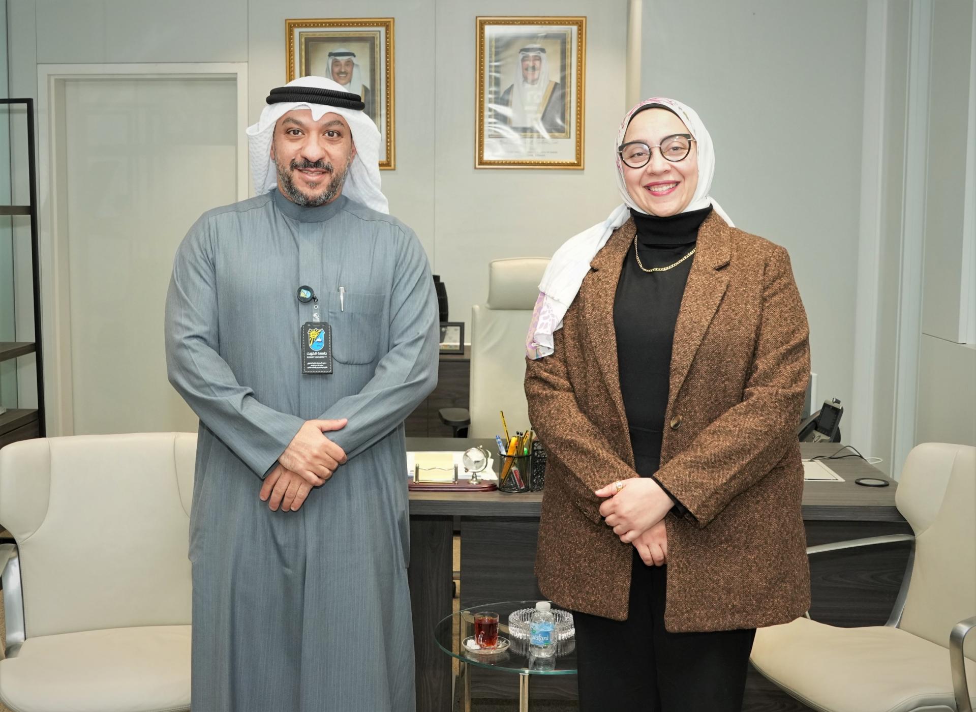 In line with efforts to strengthen academic and scientific cooperation and to discuss the preparation of a joint Memorandum of Understanding (MoU), the Acting Vice President for Academic Affairs, Prof. Abdulrahman Al-Sulaili, received a delegation from the Cultural Office of the Embassy of the Arab Republic of Egypt in the State of Kuwait, headed by Prof. Amina Abu Al-Makarim, on Tuesday, January 13, 2026, at Sabah Al-Salem University City.