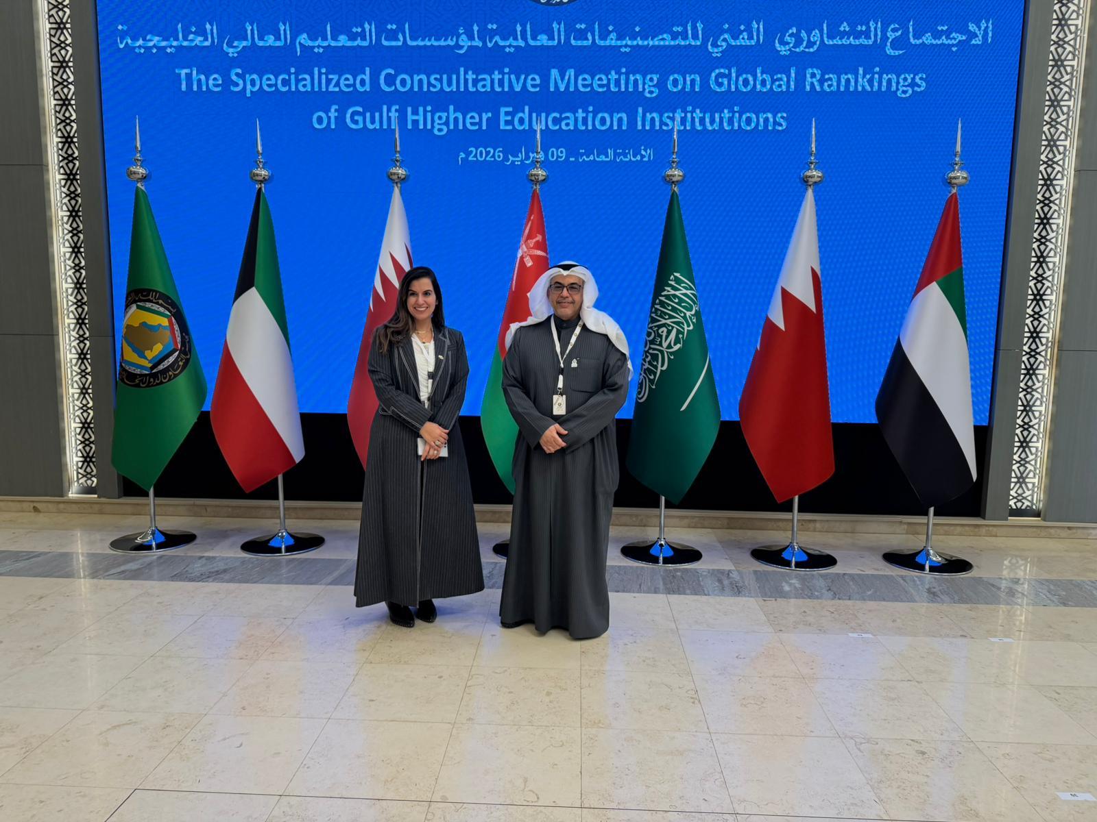 In line with its strategic vision to enhance the quality of higher education and keep pace with international ranking standards, Kuwait University, represented by Dr. Dalal Al-Taweel, Assistant Vice President for Planning and Institutional Development and Chair of the Kuwait University Ranking Enhancement Committee, participated in the Technical Consultative Meeting on Global Rankings of GCC Higher Education Institutions, organized by the GCC General Secretariat on Monday, 9 February 2026, at the Secretariat’s headquarters in Riyadh.
