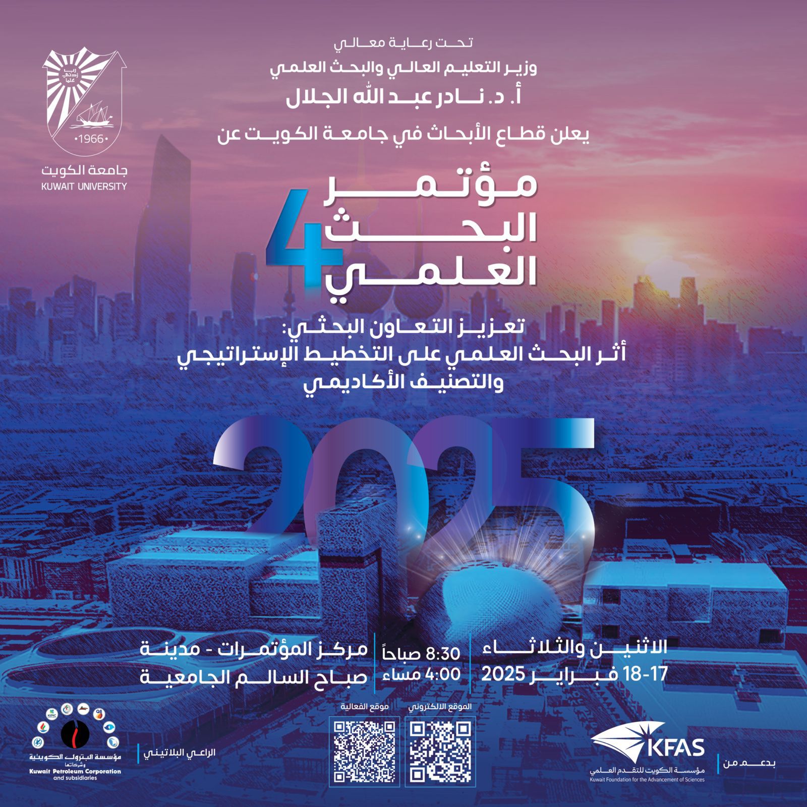 Kuwait University’s efforts in enhancing institutional capacity building make it a role model in developing advanced scientific analysis facilities. For more information about public facilities projects and research units, visit the Fourth Scientific Research Conference entitled “Research Collaboration: The Impact of Scientific Research on Strategic Planning and Academic Classification”, held under the patronage of the Minister of Education and Scientific Research, Prof. Nader Al-Jalal, on Monday and Tuesday, February 17-18, 2025, at the Conference Center - Sabah Al-Salem University City.