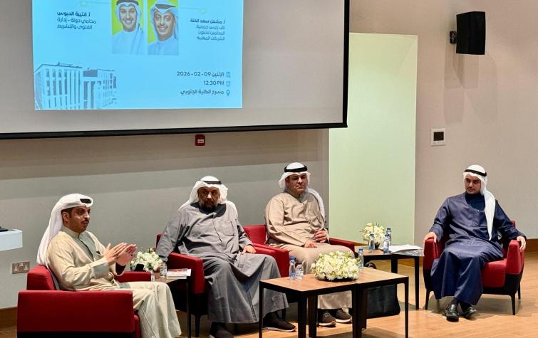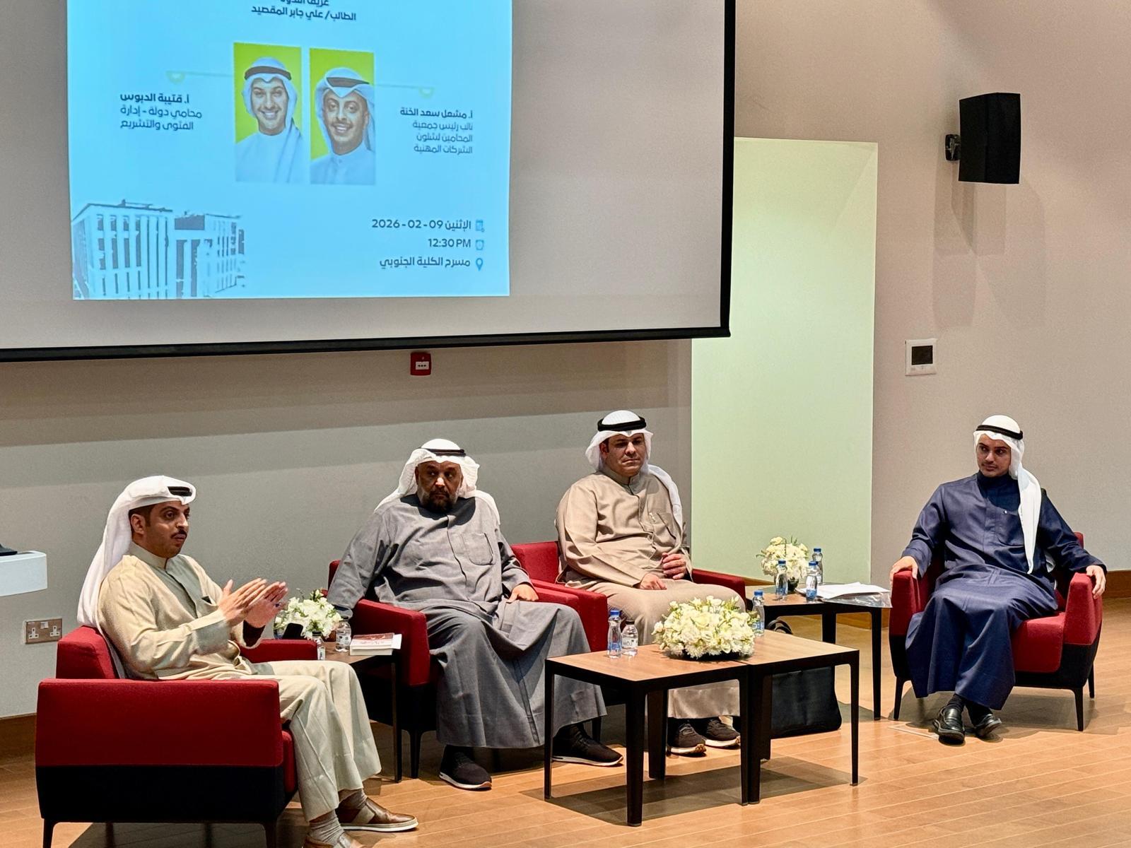 The seminar featured the participation of Dr. Mohammed Al-Mutairi, Faculty Member in the Department of Private Law; Dr. Ibrahim Al-Sharqawi, Director of the Specialized Training Center at the General Department of Investigations; Mr. Qutaiba Al-Dabbous, State Attorney at the Fatwa and Legislation Department; and Mr. Mishal Al-Khanah, Vice President of the Kuwait Lawyers Association for Professional Companies Affairs.