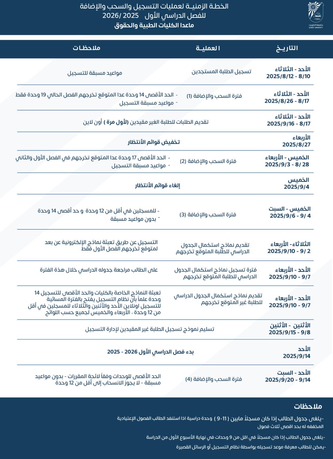 The Acting Dean of Admission and Registration at Kuwait University, Dr. Fadel Abbas Aziz, announced that registration, withdrawal, and add/drop for the first semester of the academic year 2025/2026 will commence on Sunday, 10 August 2025, and will continue until Saturday, 20 September 2025, in accordance with the timeline set by the Deanship of Admission and Registration. The schedule includes two periods with pre-assigned appointments and two periods without appointments, to accommodate the number of enrolled students and expected graduates across the various colleges of Kuwait University.