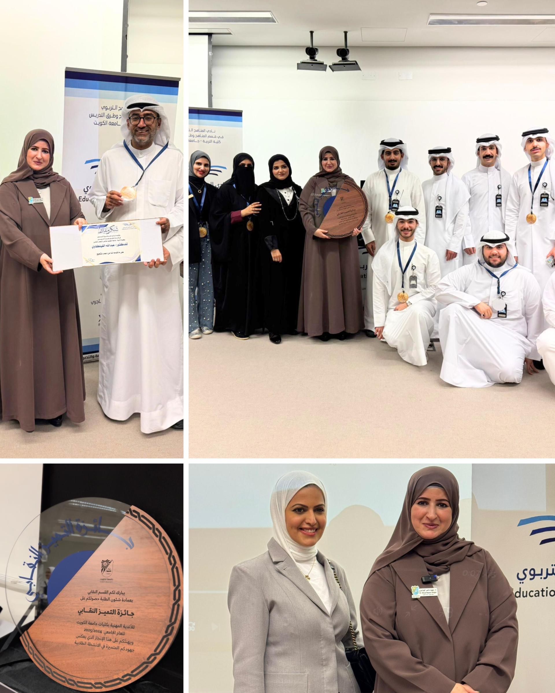 The Curriculum Club held a celebration to mark its attaining of the Union Excellence Award for Professional Clubs at Kuwait University. The event was attended by the Acting Dean of Student Affairs at Kuwait University, Prof. Jassim Al-Hamdan, the Acting Dean of the College of Education, Prof. Eisa Al-Balhan, Vice Deans Dr. Farah Al-Mutawa and Dr. Mariam Al-Mazkour, and the Acting Head of the Department of Curriculum and Teaching Methods, Dr. Noha Al-Ruwaished.
