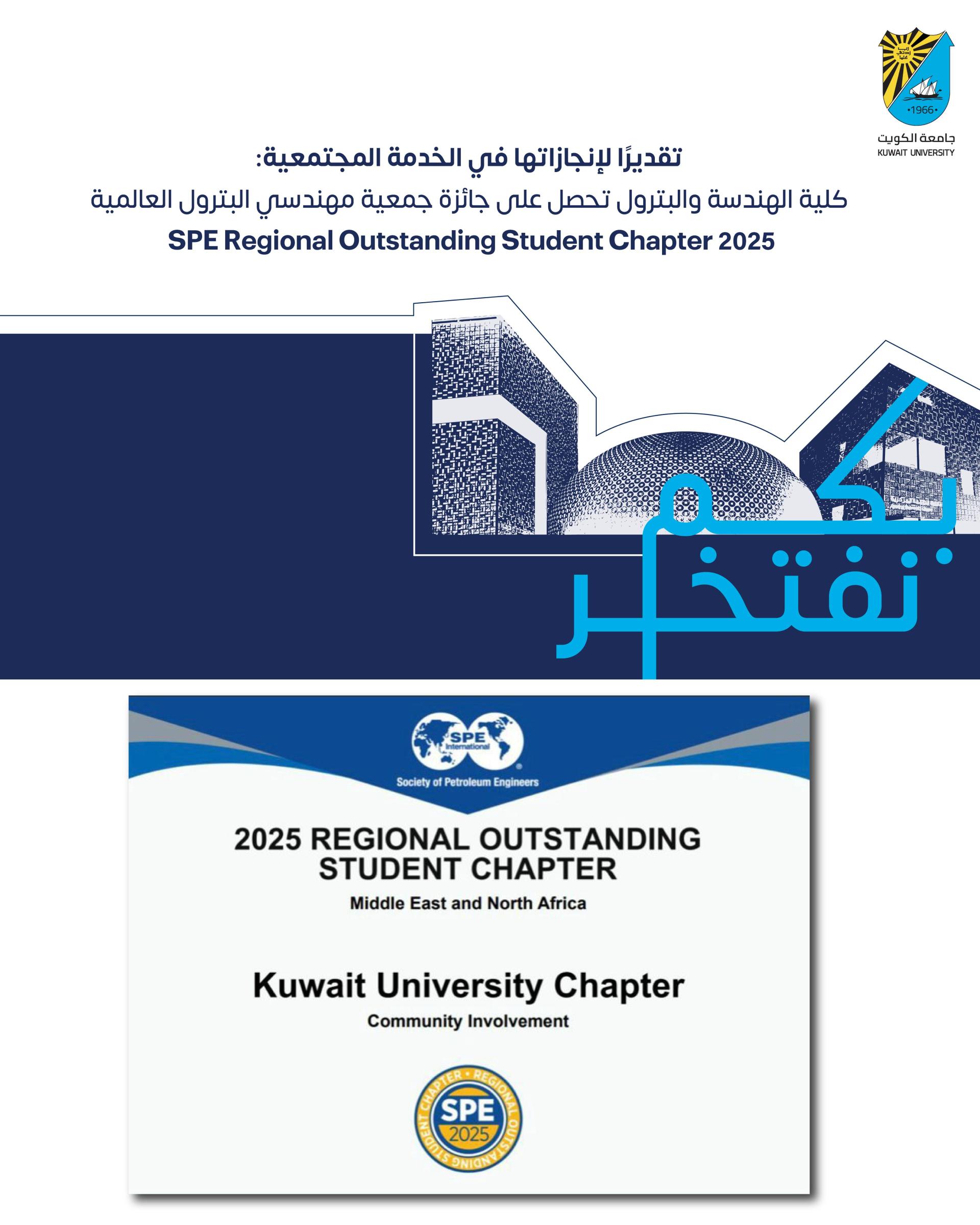 In a new achievement for the College of Engineering and Petroleum at Kuwait University, the Student Chapter of the Society of Petroleum Engineers (SPE-Student Chapter), under the supervision of Prof. Essa Mohammed Al-Safran, has been awarded the SPE Regional Outstanding Student Chapter 2025 for community engagement in the Middle East and North Africa region by the Society of Petroleum Engineers International (SPE-International).